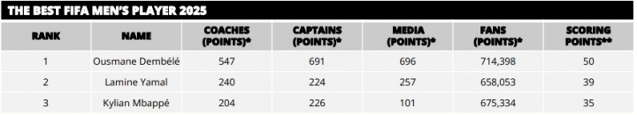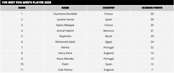FIFA最佳得票:登贝莱大幅领先,亚马尔姆总分列二三,萨拉赫第六