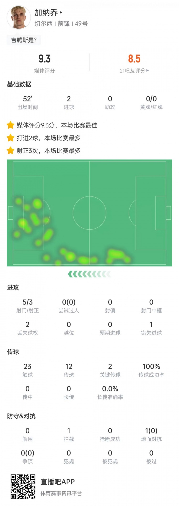 加纳乔本场数据:5次射门打进2球,2次关键传球,评分9.3全场最高